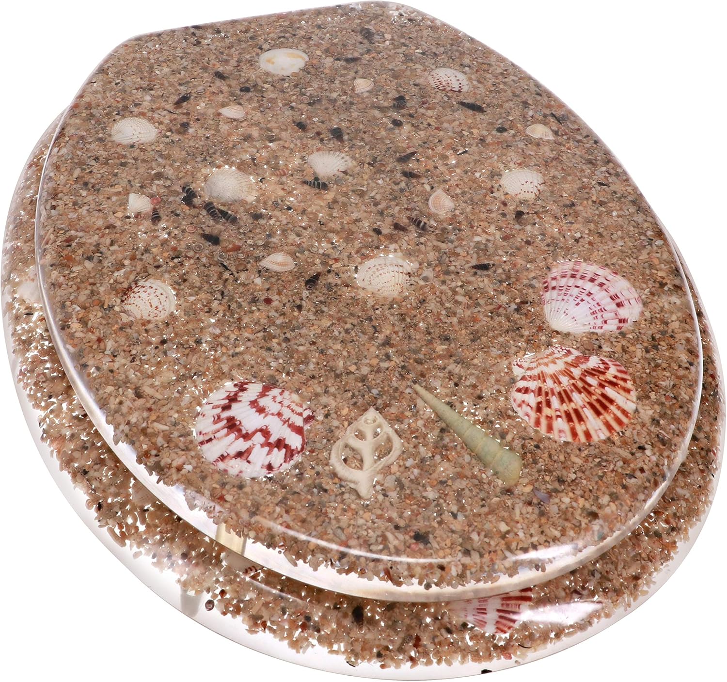 Crafted with a clear frame and decorated with attractive silver foil flakes, this resin toilet seat offers a brilliant addition to any bathroom. Made from heavy reinforced resin with chrome hinges, it can withstand stress and pressure and won't wiggle or shift when in place. It measures 18.5 inches long and is designed specifically for elongated toilets. To clean, simply wipe the toilet seat with dish soap, water, and a clean rag.
