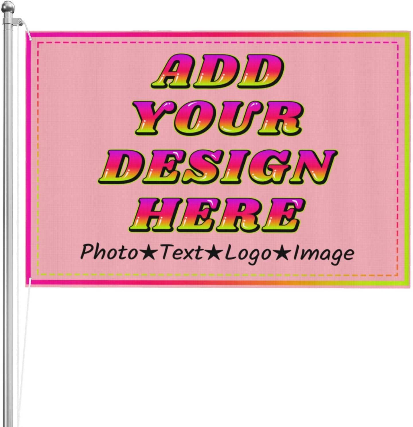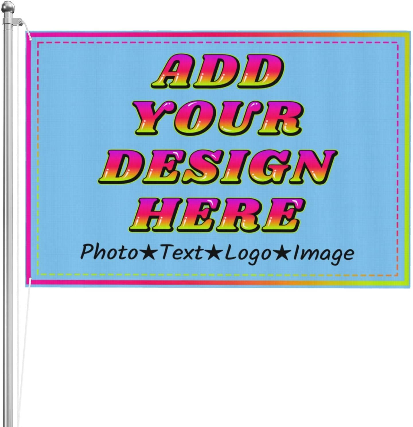 Create a look with our Custom Flag, made from polyester with vibrant, long-lasting colors. The lightweight and fast-drying material makes it suitable for indoor and outdoor display. Featuring metal grommets for easy hanging, this custom flag is for parties, events, or personal décor. The multiple sizes are suitable for diverse settings. Customize it with logos, text, or images for a personalized touch. Please note, flagpoles are not included.